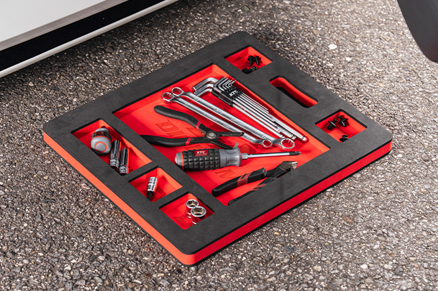 柔らかい素材が工具を置く音を吸収し、整備や作業中の工具同士が当たる音を和らげます。
