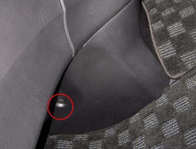 | 11)助手席側のカーペットカバーの○印にピンがありますので、ピンを外しカバーを取り外します。 | 12)運転席側のカーペットカバーの○印にピンがありますので、ピンを外しカバーを取り外します。 |